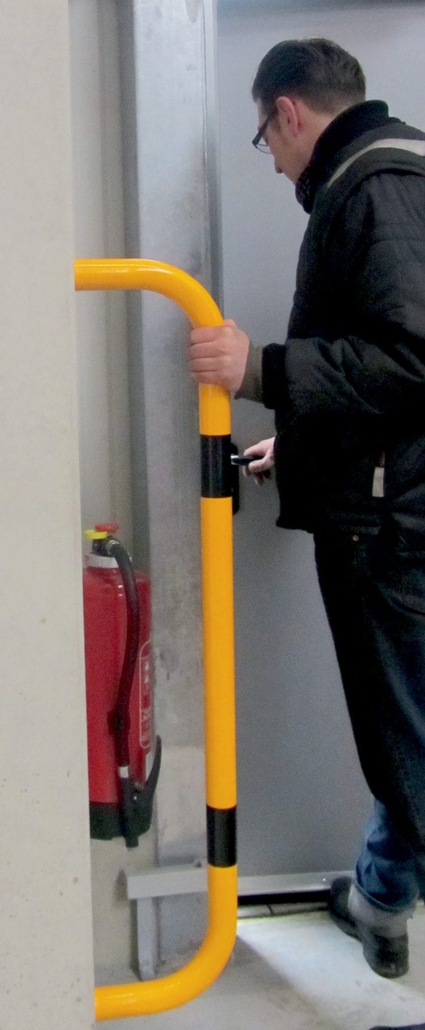 Sikkerhetsgrep for døråpninger og trappeavsatser samt beskytter av fallrør, rør, kabelsjekter etc.