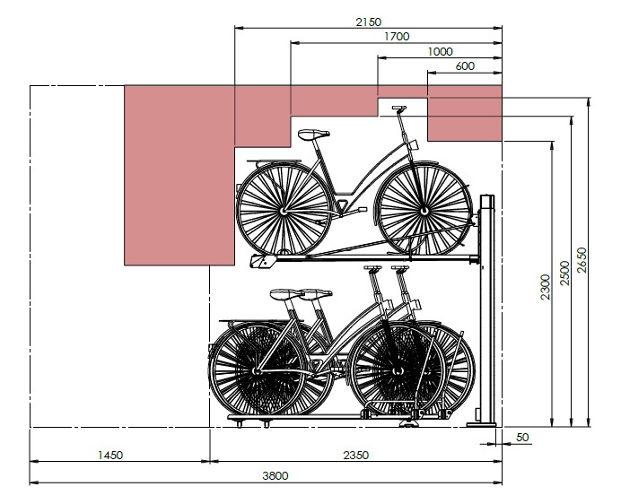 Denne unike og innovative løsningen er brukervennlig, effektiv og plassbesparende sykkelplassering. Uten anstrengelser plasseres sykkelen enkelt i øvre stativ, som tar opp til 39kg, oppbevaring av EL-sykkel er derfor ingen problem. De øvre sykkelstativene løftes enkelt til øvre posisjon, mens de nedre stativene skyves til sidene for å lettere plassere de øvre.