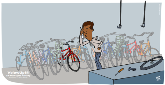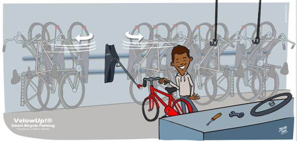 Med VelowUp! ® kan du henge en sykkel vertikalt fra forhjulet. Det unike mekanisme, VelowUp! ® hjelper deg å enkelt parkere sykkelen vertikal uten at det blir for tungt.